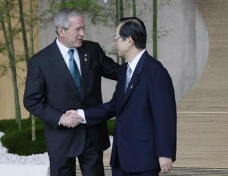 | Keywords: George W Bush and Yasuo Fukuda 20080707.jpg en President George W Bush and Prime Minister Yasuo Fukuda shake hands at the Windsor Hotel Toya Resort and Spa in Tōyako Town Abuta District Hokkaidō on July 7 2008 http //www whitehouse gov/news/releases/2008/07/images/20080707-2_d-0140-2-515h html Prime Minister Yasuo Fukuda of Japan greets President George W Bush as he arrives Monday July 7 2008 for the official G8 family photo in the grand lobby of the Windsor Hotel Toya Resort and Spa in Toyako Japan White House photo by Eric Draper White House photo by Eric Draper 2008-07-07 PD-USGov 34th G8 summit George W Bush in 2008 Yasuo Fukuda in 2008 George W Bush and Yasuo Fukuda Photographs by Eric Draper |
