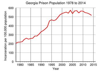 | Keywords: Georgia Prison Population.svg en Georgia prison incarceration rate per 100 000 population from 1978 to 2014 While not the highest incarceration rate Georgia though has the highest rate of adult supervision in the country Data from http //www bjs gov/index cfm ty nps BJS 2016-05-10 own Delphi234 other versions current annually Generated with Wikimedia SVG Chart SVG Chart/box cc-zero Prisons in Georgia U S state Imprisonment and detention rates in the United States | ||||