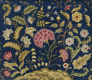 Keywords: Georgian embroidered panel.jpg Panel embroidered in crewel wools on blue linen possibly originally a chair seat cover Christie's online 5169216 ~ 1740 Author PD-art Embroidery of England Crewel embroidery Close-ups of woven textiles