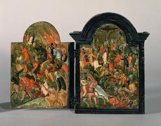 | Keywords: Georgios Klontzas - Scenes of Christ's Passion - Walters 37628 - Open.jpg This folding icon was originally a triptych three-paneled icon ; the right wing is now lost The panels that remain depict on the left Christ on the Road to Calvary and on the right the Crucifixion This icon is an excellent example of the art produced on the Greek Island of Crete then under Venetian control where the Byzantine tradition of icon painting had survived the fall of the empire The strong color contrasts fluid highlights and contorted poses of the figures suggest that the icon was painted by George Klontzas one of the most innovative Cretan icon painters of the late 16th century between 1550 1600 Early Modern tempera wood cm 18 7 14 5 3 5 accession number 37 628 35213 Don Marcello Massarenti Collection Rome date and mode of acquisition unknown Henry Walters city Baltimore Walters Art Museum Henry Walters Acquired by Henry Walters with the Massarenti Collection 1902 Holy Image Holy Space Icons and Frescoes from Greece The Walters Art Gallery Baltimore; Center for the Fine Arts Miami; Kimbell Art Museum Fort Worth; Fine Arts Museums of San Francisco San Francisco; The Cleveland Museum of Art Cleveland; The Detroit Institute of Arts Detroit; Virginia Museum of Fine Arts Richmond 1988-1990 place of origin Crete Greece Walters Art Museum license 3D Medieval art in the Walters Art Museum Georgios Klontzas Paintings in the Walters Art Museum Media contributed by the Walters Art Museum needs artist update |