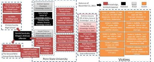 | Keywords: Gerald Sandusky Sexual Abuse Findings of Grand Jury.png SVG en Gerald Sandusky Sexual Abuse and Related Cover-ups �Illustrated from Report of Thirty Third Statewide Investigating Grand Jury Pennsylvania Attorney General Retrieved 10 November 2011 � http //www attorneygeneral gov/uploadedFiles/Press/Sandusky-Grand-Jury-Presentment pdf Color codings represent status of people as of EST evening November 9 2011 2011-11-10 own https //docs google com/open id 0BxLNnjMk2r_qOTMyNDIzYTItOGUwMS00NTI4LTljMmEtNmY2ZTM0ZmNmZmU3 powerpoint file is public domain also Skoch3 cc-zero Uploaded with UploadWizard Child sexual abuse statistics College football Child sexual abuse offenders Scandals |