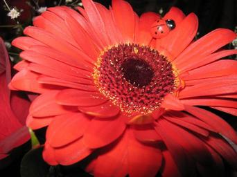 Keywords: gerbera daisy red flower ladybird sitting petals ladybugs beetle blossom close up blooms bright colorful dark background black background daisies fleurs vibrant