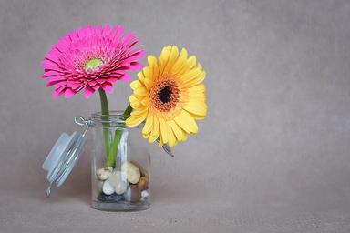 Keywords: gerbera flowers pink yellow vase glass jar deco-stones decoration deco schnittblume spring flowers spring close text freedom