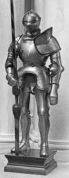 | Keywords: German - Armor and Lance for Fighting on Horseback - Walters 51578, 511336.jpg The heavily armored knight of noble birth wielding a 12' lance and mounted on a sturdy war-horse was the dominant force on the medieval battlefield from the 9th to the mid 14th century when improved weapons and training made the infantry his equal However mounted armored nobles continued to find an outlet for their war-like energies in jousting tournaments This suit of armor is made of parts that are characteristic of the mid 16th century in Germany but are not by the same maker Typical are the black painted trim and the rope-like edging seen for example around the couters elbow protectors and along the top of the breastplate Note the lance rest below the right shoulder The close-helmet provides full-face protection and has a movable visor which could be lifted to demonstrate good will or when there was no danger Many of the names for parts of the armor come from French words for the body parts that they protect as cuisse thigh gorget throat or gauntlet hand The lance Walters 51 1336 is on view in the museum with a different suit of armor Walters 51 581 Armor ca 1530; Lance 17th century steel paint and gilding are later additions wood with polychrome armor cm 166 68 44 ; lance cm 290 83 accession number 51 578 51 1336 77510 Sale American Art Association New York November 19 1921 no 314 Henry Walters city Baltimore Walters Art Museum Henry Walters Acquired by Henry Walters 1921 place of origin Switzerland Walters Art Museum license Armour in the Walters Art Museum Armour of Germany Tournament armour Renaissance applied arts in the Walters Art Museum German art in the Walters Art Museum Media contributed by the Walters Art Museum needs artist review Lances 16th-century armour |