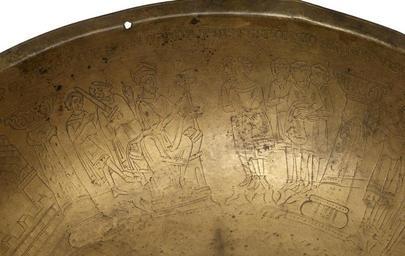 | Keywords: German - Bowl with Scenes from the Legend of St Ursula - Walters 5369 - Detail A.jpg The narrative on this basin tells the story of Saint Ursula and her 11 000 companions who embarked on a pious journey from England to the Continent only to be met by the Huns in Cologne and slaughtered Ursula was warned of her impending doom according to the legend but willingly accepted martyrdom to join the kingdom of heaven The narrative is executed in a simple engaging manner The movement of Ursula and her companions is echoed in the narrative progression around the bowl as one turns it to follow the story The kinetic dimension of the display would likely have made this manner of recounting the saint's legend more memorable than simple recitation Indeed some scholars have suggested that bronze vessels of this type might have been used for teaching while others maintain that they might have played a role in liturgical hand-washing performed by nuns In the latter instance the swirling ocean crossed by Ursula must have looked quite realistic when seen through the rippling water that filled the bowl century 12 Medieval copper alloy cm 6 5 28 7 accession number 53 69 6988 Signol M E G Reidy Sale London July 19 1929 Bacri Paris Léon Gruel Paris Henry Walters Baltimore by purchase Walters Art Museum Henry Walters Acquired by Henry Walters Transcription Engraved on rim of bowl DESPONSANDA DAT HIS RESPONSIO BLANDA / VIRGINEO QUE GRAVES MITTIT PC AGMINE NAVES / POSTQUAM TURBA RUDIS FUIT HIS EXERCITA LUDIS CARBASA PANDUNTUR AGRIPPINA QUE FERUNTUR / QUE LOCA VIRGINEIS DISCUNT SACRANDA TROPHEIS / HINC VIA DIRGITUR QUA MOX BASILEA SUBITUR; Translation The betrothed gives a favorable answer / He sends great ships for the crowd of young women / After the uneducated crowd was practiced in these games the sails are raised bearing them to Agippina Cologne / This place they teach is made sacred through the triumph of the virgins / from here they took the direct way to Basel; Transcription Engraved in the border around the central medalion URSULA SOLLICITE SACRA DISCIT DOGMATA VITAE; Translation Ursula eagerly teaches the holy dogma of life place of origin Germany Walters Art Museum license Bowl with Scenes from the Legend of St Ursula in the Walters Art Museum 53 69 Media contributed by the Walters Art Museum needs category review |