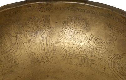 | Keywords: German - Bowl with Scenes from the Legend of St Ursula - Walters 5369 - Detail C.jpg The narrative on this basin tells the story of Saint Ursula and her 11 000 companions who embarked on a pious journey from England to the Continent only to be met by the Huns in Cologne and slaughtered Ursula was warned of her impending doom according to the legend but willingly accepted martyrdom to join the kingdom of heaven The narrative is executed in a simple engaging manner The movement of Ursula and her companions is echoed in the narrative progression around the bowl as one turns it to follow the story The kinetic dimension of the display would likely have made this manner of recounting the saint's legend more memorable than simple recitation Indeed some scholars have suggested that bronze vessels of this type might have been used for teaching while others maintain that they might have played a role in liturgical hand-washing performed by nuns In the latter instance the swirling ocean crossed by Ursula must have looked quite realistic when seen through the rippling water that filled the bowl century 12 Medieval copper alloy cm 6 5 28 7 accession number 53 69 6988 Signol M E G Reidy Sale London July 19 1929 Bacri Paris Léon Gruel Paris Henry Walters Baltimore by purchase Walters Art Museum Henry Walters Acquired by Henry Walters Transcription Engraved on rim of bowl DESPONSANDA DAT HIS RESPONSIO BLANDA / VIRGINEO QUE GRAVES MITTIT PC AGMINE NAVES / POSTQUAM TURBA RUDIS FUIT HIS EXERCITA LUDIS CARBASA PANDUNTUR AGRIPPINA QUE FERUNTUR / QUE LOCA VIRGINEIS DISCUNT SACRANDA TROPHEIS / HINC VIA DIRGITUR QUA MOX BASILEA SUBITUR; Translation The betrothed gives a favorable answer / He sends great ships for the crowd of young women / After the uneducated crowd was practiced in these games the sails are raised bearing them to Agippina Cologne / This place they teach is made sacred through the triumph of the virgins / from here they took the direct way to Basel; Transcription Engraved in the border around the central medalion URSULA SOLLICITE SACRA DISCIT DOGMATA VITAE; Translation Ursula eagerly teaches the holy dogma of life place of origin Germany Walters Art Museum license Medieval metalwork in the Walters Art Museum Bowl with Scenes from the Legend of St Ursula in the Walters Art Museum 53 69 Media contributed by the Walters Art Museum needs category review |