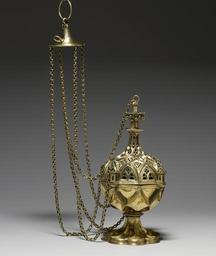 | Keywords: German - Censer - Walters 57699 - View A.jpg This censer made in Germany is typical of the style popular in western Europe at the end of the fifteenth century The intersecting raised bands mimic the complex vaulting systems used in late Gothic churches and the openwork areas are reminiscent of the tracery found in the windows of these buildings 1498 Early Modern gilded silver Overall H with chain cm 73 ; Body cm 25 4 11 6 ; Hanger cm 6 8 8 3 accession number 57 699 9570 Frédéric Spitzer Paris by purchase Sale Paul Chevallier and Charles Mannheim April 17 1893 no 347 Charles Borradaile Brighton by purchase George Robinson Harding London by purchase Henry Walters city Baltimore Acquired by Henry Walters 1912 Inscription On interior 1498 All that Glisters Thirty Centuries of Golden Deception Cooper Union Museum for the Arts of Decoration New York 1950 Love and War A Manual for Life in the Late Middle Ages National Gallery of Art Washington 1998-1999 Encompassing the Globe Freer Gallery of Art Washington 2007 place of origin Germany Walters Art Museum license Renaissance applied arts in the Walters Art Museum Medieval metalwork in the Walters Art Museum Thuribles German art in the Walters Art Museum |