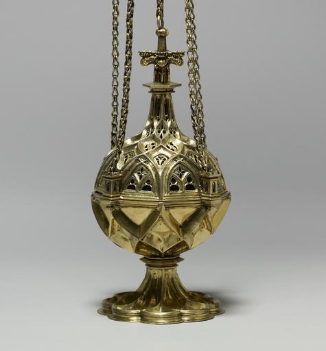 Keywords: German - Censer - Walters 57699 - View B.jpg This censer made in Germany is typical of the style popular in western Europe at the end of the fifteenth century The intersecting raised bands mimic the complex vaulting systems used in late Gothic churches and the openwork areas are reminiscent of the tracery found in the windows of these buildings 1498 Early Modern gilded silver Overall H with chain cm 73 ; Body cm 25 4 11 6 ; Hanger cm 6 8 8 3 accession number 57 699 9570 Frédéric Spitzer Paris by purchase Sale Paul Chevallier and Charles Mannheim April 17 1893 no 347 Charles Borradaile Brighton by purchase George Robinson Harding London by purchase Henry Walters city Baltimore Acquired by Henry Walters 1912 Inscription On interior 1498 All that Glisters Thirty Centuries of Golden Deception Cooper Union Museum for the Arts of Decoration New York 1950 Love and War A Manual for Life in the Late Middle Ages National Gallery of Art Washington 1998-1999 Encompassing the Globe Freer Gallery of Art Washington 2007 place of origin Germany Walters Art Museum license Renaissance applied arts in the Walters Art Museum Medieval metalwork in the Walters Art Museum Thuribles German art in the Walters Art Museum |