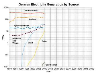 | Keywords: German electricity generation 1980-2050 semilog.png en Electricity generation in Germany 1980-2050 semilog showing the growth of renewable energy created using data from http //www eia gov/cfapps/ipdbproject/IEDIndex3 cfm tid 2 pid 2 aid 12 EIA This file can and will be updated as new data becomes available 2012-09-13 19 27 12 own Delphi234 cc-zero Uploaded with UploadWizard Electricity production trends | ||||