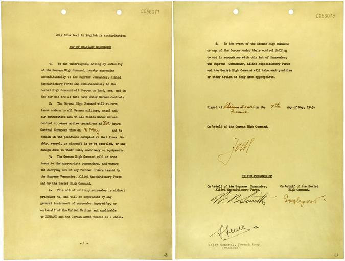 | Keywords: German instrument of surrender1a.jpg This instrument of surrender was signed on May 7 1945 at Gen Dwight D Eisenhower's headquarters in Rheims by Gen Alfred Jodl Chief of Staff of the German Army At the same time he signed three other surrender documents one each for Great Britain Russia and France Signatories On behalf of the German High Command JODL IN THE PRESENCE OF On behalf of the Supreme Commander Allied Expeditionary Force W B SMITH On behalf of the Soviet High Command SOUSLOPAROV F SEVEZ Major General French Army Witness http //www ourdocuments gov/doc php flash true doc 78 ourdocuments gov 1945-05-07 Office of War Information PD-USGov German Instrument of Surrender May 7 1945 - page 1 jpg German Instrument of Surrender May 7 1945 - page 2 jpg Interim step in the restoration of Image German instrument of surrender jpg Stains and dirt removed Levels adjusted but no other change World War II German surrender documents German surrender of 7 May 1945 in Reims François Sevez |