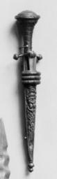 | Keywords: German - "Landsknecht" Dagger and Sheath - Walters 51527 - Group.jpg A dagger of this type might be carried by a German Landsknecht or mercenary foot soldier derived from Knecht meaning servant or farm hand in the early 16th century It served in the field both as a weapon and as a tool The blade is inscribed on each side I A N between quatrefoils of punch marks; in addition a maker's mark is impressed on the back The blackened iron sheath contains as well a smaller knife the blade bearing the mark of three small crosses and a skewer for use in camp century 16 Early Modern steel dagger ; iron wood and leather sheath dagger cm 6 2 26 6 4 7 ; knife cm 1 4 18 6 0 5 ; sheath cm 4 2 21 9 4 4 accession number 51 527 34888 Zschille Sale London 1897 no 47 Henry Griffith Keasbey Henry Griffith Keasbey Collection Sale American Art Association New York November 29 1924 no 192 Henry Walters city Baltimore Walters Art Museum Henry Walters Acquired by Henry Walters 1924 Inscribed I A N place of origin Germany Walters Art Museum license Weapons in the Walters Art Museum Renaissance applied arts in the Walters Art Museum German art in the Walters Art Museum Renaissance daggers |
