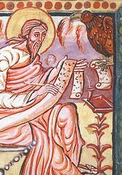 | Keywords: German - Leaf from Gospels - Walters W4178V - Reverse Detail.jpg During the Carolingian period the emulation of Roman classical models provided an opportunity to re-explore the naturalistic rendering of figures after a period of extreme schematization The influence of ancient prototypes is particularly evident in the portrayals of the Evangelists which were modeled on portraits of classical philosophers In this gospel book made in Freising Germany around 875 the Evangelist John sits on a stool in an open landscape In his left hand he holds the end of a long scroll on which he writes with his right hand An inkpot rests on the desk in front of him while an eagle his symbol holds in its talons another scroll inscribed with God's words The choice of a scroll rather than a codex is a clear allusion to ancient philosophers even though here the Evangelist writes across the width of a scroll as in a book and not down the length of the scroll as in Antiquity But unlike the sober stance seen in Antique depictions of philosophers here John is depicted in the frenzy of divine inspiration his pen running rapidly across the surface of the scroll The large colorful brushstrokes with which the artist built this scene contribute to the effect of rapt energy The interest in the decorative possibilities of line belies the naturalism of ancient prototypes while the drapery folds have little relationship to the body underneath ca 875 Medieval ink paint parchment cm 17 9 12 1 accession number W 4 178V 35282 Germany 19th century Leon Gruel and Robert Engelmann Paris late 19th-early 20th century mode of acquisition unknown Henry Walters Baltimore February 16 1917 mode of acquisition unknown Walters Art Museum Henry Walters Acquired by Henry Walters 1917 Illuminating the Word Gospel Books in the Middle Ages The Walters Art Museum Baltimore 2004 place of origin Freising Germany Walters Art Museum license 2D Miniatures of Saint John the Evangelist Walters MS W4 - Freising Gospels Location not applicable |