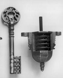| Keywords: German - Lock Nut with Key - Walters 52137.jpg The 'nut' is the lock mechanism usually hidden within an exterior casing Renaissance locks were 'warded' - that is the lock mechanism was based on a series of metal barriers wards designed to frustrate the entry of all but the correct key Keys for such locks have grooves to match the configuration of the metal barriers; after bypassing the wards the key is free to turn and unlatch a horizontal bolt unlocking the door or chest between 1600 1675 iron lock cm 16 51 12 07 ; key cm 20 64 accession number 52 137 27606 Charles T Yerkes 1837-1905 date and mode of acquisition unknown Charles T Yerkes Estate Sale American Art Association New York 1910 no 490 or 491 Henry Walters city Baltimore Walters Art Museum Henry Walters Acquired by Henry Walters 1910 Safe and Secure Keys and Locks Cooper-Hewitt National Design Museum New York 1987 place of origin Germany Walters Art Museum license Baroque art in the Walters Art Museum German art in the Walters Art Museum Media contributed by the Walters Art Museum needs category review |