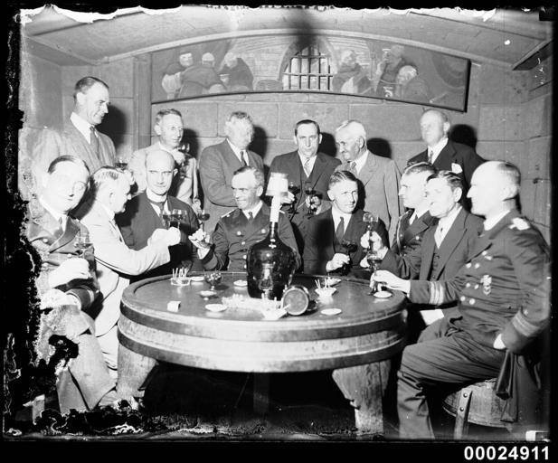 | Keywords: samuel j hood collection samueljhoodcollection hood collection hoodcollection sydney koln german navy germannavy german naval officers germannavalofficers military personnel militarypersonnel drinking celebration wine officers naval personnel navalpersonnel naval officers navalofficers commander otto schniewind ottoschniewind commander otto schniewind commanderottoschniewind german consul-general dr rudolf asmis germanconsulgeneraldrrudolfasmis rudolf asmis rudolfasmis george street georgestreet leo buring leoburing ye olde crusty cellars yeoldecrustycellars blackandwhite people monochrome black and white This image depicts officers and visitors enjoying wine at Leo Buring's 'Ye Olde Crusty Cellars' on 255 George Street in Sydney. The man in the centre and seated (to left of the large bottle) is Captain Otto Schniewind (later Generaladmiral), commander of KOLN. The man to his right is German Consul-General, Dr Rudolf Asmis. The photograph was taken during the German Navy's visit in May 1933. This photo is part of the Australian National Maritime Museum’s Samuel J. Hood Studio collection. Sam Hood (1872-1953) was a Sydney photographer with a passion for ships. His 60-year career spanned the romantic age of sail and two world wars. The photos in the collection were taken mainly in Sydney and Newcastle during the first half of the 20th century. The ANMM undertakes research and accepts public comments that enhance the information we hold about images in our collection. This record has been updated accordingly. Photographer: Samuel J. Hood Studio Collection Object no. 00024911 This image depicts officers and visitors enjoying wine at Leo Buring's 'Ye Olde Crusty Cellars' on 255 George Street in Sydney. The man in the centre and seated (to left of the large bottle) is Captain Otto Schniewind (later Generaladmiral), commander of KOLN. The man to his right is German Consul-General, Dr Rudolf Asmis. The photograph was taken during the German Navy's visit in May 1933. This photo is part of the Australian National Maritime Museum’s Samuel J. Hood Studio collection. Sam Hood (1872-1953) was a Sydney photographer with a passion for ships. His 60-year career spanned the romantic age of sail and two world wars. The photos in the collection were taken mainly in Sydney and Newcastle during the first half of the 20th century. The ANMM undertakes research and accepts public comments that enhance the information we hold about images in our collection. This record has been updated accordingly. Photographer: Samuel J. Hood Studio Collection Object no. 00024911 This image depicts officers and visitors enjoying wine at <a href="http://acms.sl.nsw.gov.au/search/simpleSearch.aspx?authority=place&ID=41127" rel="nofollow">Leo Buring's 'Ye Olde Crusty Cellars'</a> on 255 George Street in Sydney. The man in the centre and seated (to left of the large bottle) is Captain Otto Schniewind (later Generaladmiral), commander of KOLN. The man to his right is German Consul-General, Dr Rudolf Asmis. The photograph was taken during the German Navy's visit in May 1933.