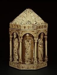 | Keywords: German - Reliquary with Apostles - Walters 71146.jpg This octagonal reliquary or container for saints' relics is decorated with standing figures of eight apostles all carved in a compact linear style more typical of the 11th and 12th centuries The shape of the reliquary though is 13th-century The plaques are carved from bone which was more plentiful and less expensive than elephant ivory The reliquary one of seven small tower-shaped vessels to survive from Cologne originally rested on four short feet and was crowned by a knob finial middle Other date century 13 Medieval bone on wooden frame with gold gilding and red and green paste inlays cm 20 13 2 13 3 accession number 71 146 33139 Henry Walters Baltimore by purchase Walters Art Museum Henry Walters Acquired by Henry Walters Transcription Scrolls held by each apostle inscribed with carved letters filled with alternating gold gilt and paste infill read PETRVS/S PAVLVS/S ANDREAS/S IACOES/S THOMAS/S MATHEVS/S IHILIPPVS/S IOHANNES; Translation Saints Peter Paul Andrew James Thomas Matthew Phillip and John Transcription Tablets held by evangelist symbols on the plaques of the octagonal roof are inscribed with paste infilled letters MAR/CUS/LUC/AS/MAT/HEUS/IOH; Translation Mark Luke Matthew and John Ivory The Sumptuous Art The Walters Art Gallery Baltimore 1983-1984 Reliquaries and Ritual Medieval Objects of Devotion The Walters Art Gallery Baltimore 1984-1985 place of origin Cologne Germany Walters Art Museum license Medieval ivory in the Walters Art Museum Medieval reliquaries German art in the Walters Art Museum Media contributed by the Walters Art Museum needs category review Octagonal containers |