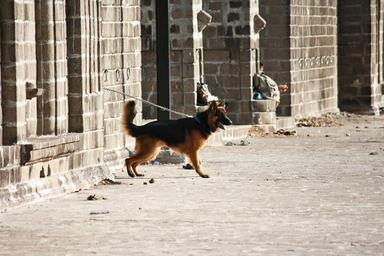 Keywords: german shepherd dog guard alert chained standing pet canine breed domestic urban outdoors