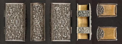 | Keywords: bookbinding historic antique book binding indoor Contemporary German silver binding patterned with flowers and scrolling foliage hammered into relief from the reverse side. The covers and clasps are hinged, and there are pierced text-block retainers at the head and tail. The endpapers are red and gold. The text edges are gilt. Created in Ulm c.1700; the city mark occurs on the lower turn-in of the back cover and on the lower clasp. Possibly bound by Johann Adam Kienlin (1661-1740). Purchased 2008. Jesum liebender Seelen tägliche Himmel-Reis (Nürnberg: In Verleg. Joh. Andreä Endters Seel. Söhne, 1692). RGer GOBEL Jesum 1692 Contemporary German silver binding patterned with flowers and scrolling foliage hammered into relief from the reverse side. The covers and clasps are hinged, and there are pierced text-block retainers at the head and tail. The endpapers are red and gold. The text edges are gilt. Created in Ulm c.1700; the city mark occurs on the lower turn-in of the back cover and on the lower clasp. Possibly bound by Johann Adam Kienlin (1661-1740). Purchased 2008. Jesum liebender Seelen tägliche Himmel-Reis (Nürnberg: In Verleg. Joh. Andreä Endters Seel. Söhne, 1692). RGer GOBEL Jesum 1692 |