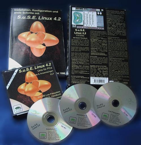| Keywords: German SuSE Linux 4.2 Box Manual and CDs.jpg SuSE Linux 4 2 Box with Manual and 3 CD-ROMs; 5th edition 1996 Photo taken by myself with Pentax Optio S40 / edited with The GIMP Dirk Meyer 2005-05-29 Category Computing Taken with Pentax Optio S40 SuSE |