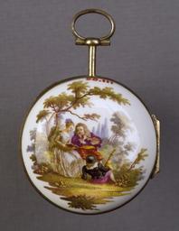 | Keywords: German - Watch with a Scene of Musicians - Walters 58111.jpg Walters Art Museum artwork Anonymous German This watchcase is decorated with a scene of a man playing a flute a girl singing and a second man reclining holding the neck of a stringed instrument The composition is derived from L'Accord Parfait Perfect Accord ca 1719 by Antoine Watteau 1684-1721 now in the collection of the Los Angeles County Museum of Art AC1999 18 1 ca 1765 porcelain silver-gilt cm 4 6 accession number 58 111 35037 Anatole Demidoff Prince of San Donato 1812-1870 Tiffany and Company New York prior to 1893 mode of acquisition unknown on 1893 list no 42 Henry Walters Baltimore after 1893 mode of acquisition unknown Walters Art Museum Henry Walters Acquired by Henry Walters after 1893 place of origin Meissen Germany Walters Art Museum license German art in the Walters Art Museum Timepieces in the Walters Art Museum Meissen porcelain Pocket watches House of Demidov's collections 1760s jewellery 18th-century watches |