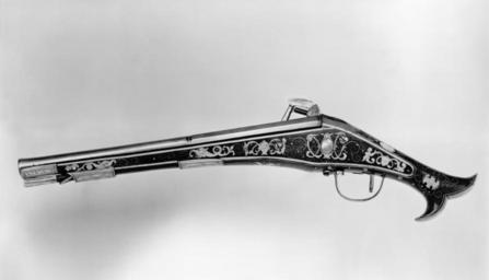 | Keywords: German - Wheellock pistol with inlaid grotesque masks - Walters 51441.jpg The proportions and balance of this pistol including the fishtail butt curving around the hand are visually pleasing and also make this 3 lb 5 3 oz gun easier to handle The relative crudeness of the manufacture including the inlaid decoration taken from a pattern book indicates that the pistol was made for a cavalryman as opposed to an aristocratic officer There are two marks stamped on the pistol the maker's mark which although found on other guns has not been identified; and the control mark on the barrel indicating that it has been inspected for quality in Nuremberg between 1575 1590 steel or iron wood walnut bone or antler and engraved mother-of-pearl inlay; parts replaced L cm 57 accession number 51 441 2093 Thewalt Sale Cologne 1903 no 1697 Henry Griffith Keasbey New York date and mode of acquisition unknown Sale American Art Association New York December 5 1924 no 139 Henry Walters city Baltimore Walters Art Museum Henry Walters Acquired by Henry Walters 1924 place of origin Nuremberg Germany Walters Art Museum license Baroque art in the Walters Art Museum Weapons in the Walters Art Museum German art in the Walters Art Museum Weapons of Germany Wheellock pistols |