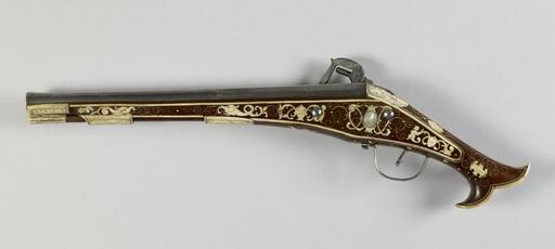 | Keywords: German - Wheellock pistol with inlaid grotesque masks - Walters 51441 - Side A.jpg The proportions and balance of this pistol including the fishtail butt curving around the hand are visually pleasing and also make this 3 lb 5 3 oz gun easier to handle The relative crudeness of the manufacture including the inlaid decoration taken from a pattern book indicates that the pistol was made for a cavalryman as opposed to an aristocratic officer There are two marks stamped on the pistol the maker's mark which although found on other guns has not been identified; and the control mark on the barrel indicating that it has been inspected for quality in Nuremberg between 1575 1590 steel or iron wood walnut bone or antler and engraved mother-of-pearl inlay; parts replaced cm 57 accession number 51 441 2093 Thewalt Sale Cologne 1903 no 1697 Henry Griffith Keasbey New York date and mode of acquisition unknown Sale American Art Association New York December 5 1924 no 139 Henry Walters city Baltimore Walters Art Museum Henry Walters Acquired by Henry Walters 1924 place of origin Nuremberg Germany Walters Art Museum license Baroque art in the Walters Art Museum Weapons in the Walters Art Museum German art in the Walters Art Museum Weapons of Germany Wheellock pistols Engraved weapons |