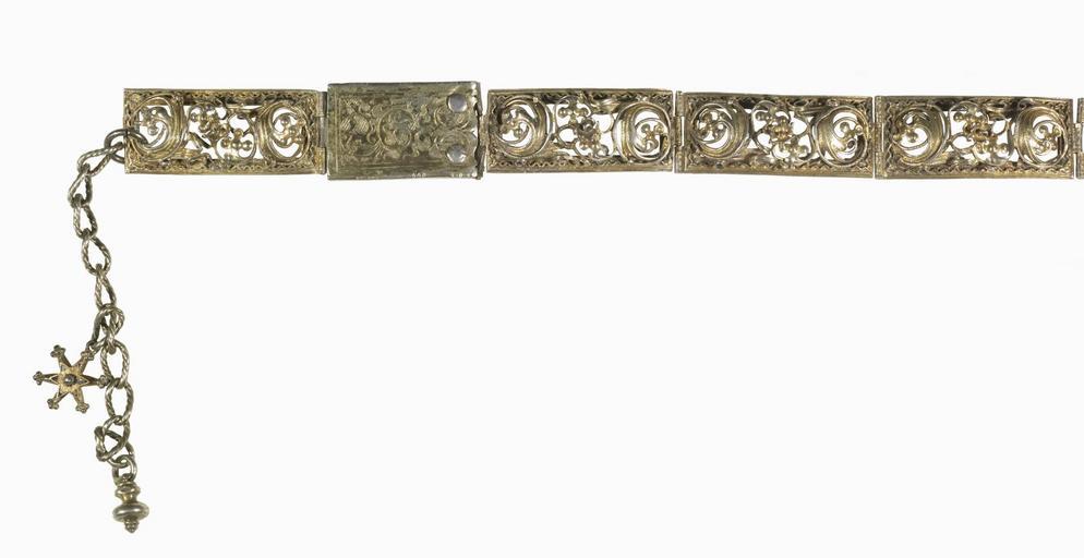 Keywords: German - Women's Girdle with Hexagram Pendant - Walters 571866 - Detail A.jpg A girdle was a loose belt that women wore hooked around the waist and from which might be suspended a pomander scent holder an amulet keys or a small purse It might consist of simple gold links or be highly worked as is this example The six-pointed star hexagram suspended from the girdle was recognized in the mid 16th century by Christians Jews and Muslims alike as a symbol that could draw the protection of God to the wearer ca 1550 Renaissance gilt on silver enamel rock crystal cm 60 5 accession number 57 1866 34968 Mathias Komor New York New York date and mode of acquisition unknown Walters Art Museum 1957 by purchase Museum purchase 1957 Jewelry - Ancient to Modern The Walters Art Gallery Baltimore 1979-1980 place of origin Silesia in present-day Germany Walters Art Museum license Renaissance applied arts in the Walters Art Museum Jewellery in the Walters Art Museum German art in the Walters Art Museum Media contributed by the Walters Art Museum needs category review |