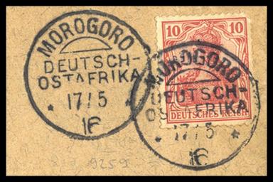 | Keywords: GermanEastAfrica10pf1916germania-morogoro.jpg Germania postage stamp of German empire double cancelled in Morogoro German East Africa as Konigsberg provisional issue 10 pfennigs used as 7½ hellers 17 May 1916 Почтовая ма ка Ге манской импе ии се ии Ге мания с двойным гашением о ого о Ге манская Восточная Аф ика как п овизо ий Кёнигсбе га 10 пфеннигов использована как 7½ гелле ов 17 мая 1916 own collection 1916 Creator Paul Eduard Waldraff Scanned by User Nickpo PD-Tanzania PD-Germany-§134-KUG PD-1923 Germania stamps 1916 stamps of the German Empire German East Africa Postmarks of Germany Morogoro |