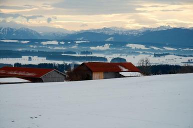 Keywords: germany bavaria mountain sky bavarian scenic hill clouds season winter snow farm field barn nature trees forest