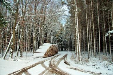 Keywords: germany bavaria snow winter tracks trail path forest trees foliage woods wood pile wood country firewood stack rural