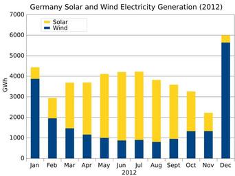 | Keywords: Germany Electricity Generation from Wind and Solar Bar Chart-2012.svg translate yes en Comparison of wind power and solar power generated each month in Germany in 2012 showing that wind and solar are complementary There is more wind in the winter but there is more solar in the summer Data fromhttps //www entsoe eu/publications/statistics/monthly-statistics/Pages/default aspx 2014-06-15 own Delphi234 cc-zero 2012 in Germany Renewable energy statistics of Germany Uploaded with UploadWizard |