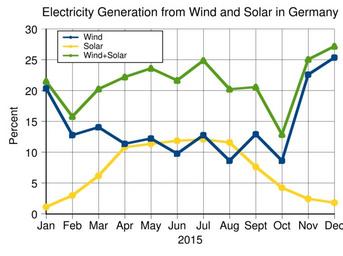 | Keywords: Germany Electricity Generation from Wind and Solar in 2015.svg translate yes en Electricity generation from wind and solar in Germany as a percent of consumption each month in 2015 Data from ENTSO-E https //www entsoe eu/db-query/production/monthly-production-for-a-specific-country 2016-04-09 own Delphi234 other versions Generated with Wikimedia SVG Chart SVG Chart/box cc-zero Renewable energy statistics of Germany 2015 in Germany | ||||