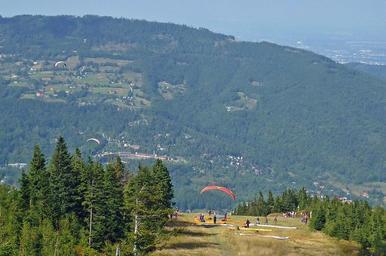 Keywords: germany landscape sky clouds mountains buildings valley ravine hang-gliders hang gliding flying floating forest trees woods people scenic nature outside country countryside summer spring