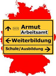 Keywords: germany map traffic sign town sign arrow poverty employment office hartz iv training school social criticism education labour market impoverishment unemployment