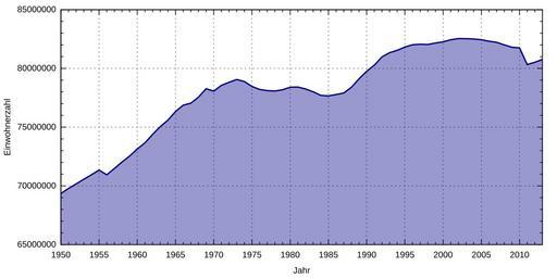 | Keywords: Germany population.svg en Germany's population 1950-2013 de Einwohnerentwicklung von Deutschland seit 1950 own ; data from https //www destatis de/DE/ZahlenFakten/Indikatoren/LangeReihen/Bevoelkerung/lrbev03 html Statistisches Bundesamt Deutschland Gorgo 2012-08-22 Gnuplot script to generate this plot gnuplot <source lang gnuplot > /usr/bin/gnuplot gnuplot 4 2 / Ubuntu 8 10 input set timefmt Y set datafile separator ; output unset key set style data lines set style fill transparent solid 0 4 set grid set xdata time set xlabel 'Jahr' set xrange '1950' '2013' set xtics 157680000 set mxtics 5 set format x ' Y' set ylabel 'Einwohnerzahl' set ytics 5000000 set mytics 5 set format y ' 0f' set yrange 65000000 85000000 set term svg size 800 400 font Arial 10 set output 'germany_population svg' plot '-' using 1 2 with filledcurves below x1 lt rgb 'dark-blue' lw 2 2013;80767000 2012;80524000 2011;80328000 2010;81752000 2009;81802000 2008;82002000 2007;82218000 2006;82315000 2005;82438000 2004;82501000 2003;82532000 2002;82537000 2001;82440000 2000;82260000 1999;82163000 1998;82037000 1997;82057000 1996;82012000 1995;81817000 1994;81539000 1993;81338000 1992;80975000 1991;80275000 1990;79753000 1989;79113000 1988;78390000 1987;77900000 1986;77780000 1985;77661000 1984;77709000 1983;78008000 1982;78248000 1981;78418000 1980;78397000 1979;78180000 1978;78073000 1977;78111000 1976;78209000 1975;78465000 1974;78882000 1973;79053000 1972;78821000 1971;78556000 1970;78069000 1969;78269000 1968;77550000 1967;77038000 1966;76864000 1965;76336000 1964;75591000 1963;75046000 1962;74383000 1961;73668000 1960;73147000 1959;72543000 1958;72031000 1957;71475000 1956;70943000 1955;71350000 1954;70945000 1953;70566000 1952;70164000 1951;69785000 1950;69346000 e </source> Cc-zero Temporal population graphs of Germany Images with Gnuplot source code |