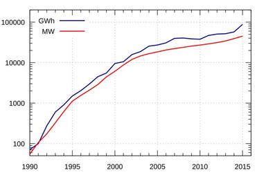 | Keywords: GermanyWind.svg en Wind energy in Germany since 1990; blue production in GWh per year red installed capacity in MW de Entwicklung der Windenergie in Deutschland seit 1990; blau Jahresproduktion in GWh rot installierte Leistung in MW 2016-04-18 own ; fork of Gorgo's File Windenergygermany svg; data from http //www erneuerbare-energien de/EE/Navigation/DE/Service/Erneuerbare_Energien_in_Zahlen/Zeitreihen/zeitreihen html Bundesministerium für Wirtschaft und Energie Log-plot by Limulus with further modifications by Delphi234 Windenergygermany svg Gnuplot script to generate this plot Please note this generates the 18 April 2016 version gnuplot <source lang gnuplot > set timefmt Y set datafile separator ; set term svg size 600 400 font Arial 16 set output 'GermanyWind svg' set key left set style data lines set grid set xdata time set xrange '1990' '2016' set xtics 157788000 set format x ' Y' set logscale y set yrange 50 200000 set mytics 10 plot '-' using 1 2 title ' GWh' axes x1y1 lt rgb 'dark-blue' lw 2 \ '-' using 1 2 title 'MW' axes x1y1 lt rgb 'red' lw 2 1990;71 1991;100 1992;275 1993;600 1994;909 1995;1500 1996;2032 1997;2966 1998;4489 1999;5528 2000;9513 2001;10508 2002;15786 2003;18713 2004;25509 2005;27229 2006;30710 2007;39713 2008;40574 2009;38648 2010;37793 2011;46883 2012;50670 2013;51708 2014;57357 2015;87975 e 1990;55 1991;106 1992;174 1993;326 1994;618 1995;1121 1996;1549 1997;2089 1998;2877 1999;4435 2000;6097 2001;8738 2002;11976 2003;14593 2004;16612 2005;18375 2006;20568 2007;22183 2008;23815 2009;25662 2010;27092 2011;29045 2012;31264 2013;34271 2014;39193 2015;45018 e </source> cc-zero Wind energy statistics of Germany SVG charts in German Images with Gnuplot source code |
