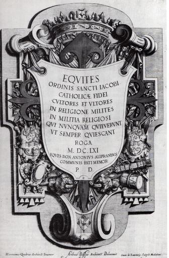 | Keywords: Gerolamo Quadrio, Andrea Biffi, Cesare De Lorenzo - Lapide dei cavalieri di Santiago. Milano, 1669.jpg it Stampa raffigurante il sepolcro dei Cavalieri dell'Ordine di Santiago esistente fino agli anni cinquanta del Novecento nella chiesa di San Marco in Milano scolpita alla base l'arma del Conte Don Antonio degli Aliprandi Cavaliere di Santiago e Provveditore dell'Ordine nello Stato di Milano Si nota un errore nel disegno dello stemma in quanto i colori del grembiato sono invertiti 1669 Archivio di Stato di Milano Gerolamo Quadrio Andrea Biffi Cesare De Lorenzo PD-old-100 Uploaded with UploadWizard Order of Santiago House of Aliprandi San Marco Milan |