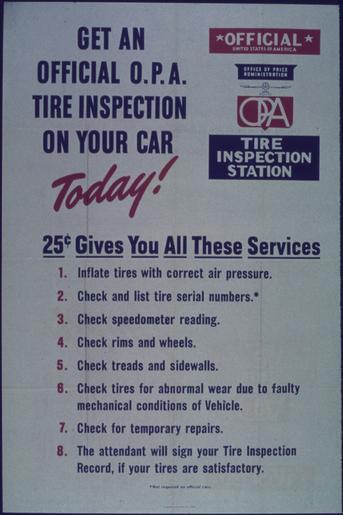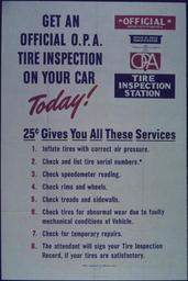 | Keywords: "Get an Official OPA Tire Inspection on your Car Today" - NARA - 514354.tif Scope and content General notes 514354 Local identifier 44-PA-860 Office for Emergency Management Office of War Information Domestic Operations Branch Bureau of Special Services 03/09/1943 - 09/15/1945 Still Picture Records Section Special Media Archives Services Division NWCS-S National Archives at College Park 8601 Adelphi Road College Park MD 20740-6001 1941 - 1945 Record group Record Group 44 Records of the Office of Government Reports 1932 - 1947 Record group ARC 373 World War II Posters compiled 1942 - 1945 Series ARC 513498 File unit File unit ARC Variant control numbers NAIL Control Number NWDNS-44-PA-860 yes Other versions <gallery> File Get_an_Official_OPA_Tire_Inspection_on_your_Car_Today _-_NARA_-_514354 tif tif File Get_an_Official_OPA_Tire_Inspection_on_your_Car_Today _-_NARA_-_514354 jpg jpg </gallery> NARA-cooperation PD-USGov World War II posters about tires from the United States NARA TIF images with categorized JPGs Gas station signs in the United States Office of Price Administration |