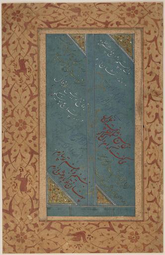 | Keywords: Ghazal by Sa'di.png en This calligraphic fragment contains a ghazal lyric poem by the Persian poet Shaykh Sa'di died 1292 691 AH The verses describe a lover's search for his beloved and his request that she show herself to him The verses are written in nasta'liq script using white light blue red and yellow ink on a blue paper Rangin colored inks add variety to the composition and are found in a number of calligraphies produced during the 16th century The corners left open by the intersection of the diagonal verses and the rectangular frame are decorated by illuminated triangles or thumb pieces The text panel is framed by a border consisting of cream-colored paper decorated with gold flecks cut out and pasted to the folio The composition is placed on a larger beige sheet of paper decorated with deer birds and various vegetal motifs The fragment is neither dated nor signed However it appears to have been produced in Safavid Iran and placed later into a muraqqa' album of calligraphies fa غزل ŒÙ‡Ø§ÛŒÛŒ از سعدی به خط نستعلیق به سبک رنگین century 16 CE http //www wdl org/en/item/2423/ Ghazal by Sa'di Creator Saadi Custom license marker 2012 09 09 PD-old-100 Uploaded with UploadWizard Sa'di Persian manuscripts Manuscripts in Iran Nastaliq Rangin 16th-century illuminated manuscripts |