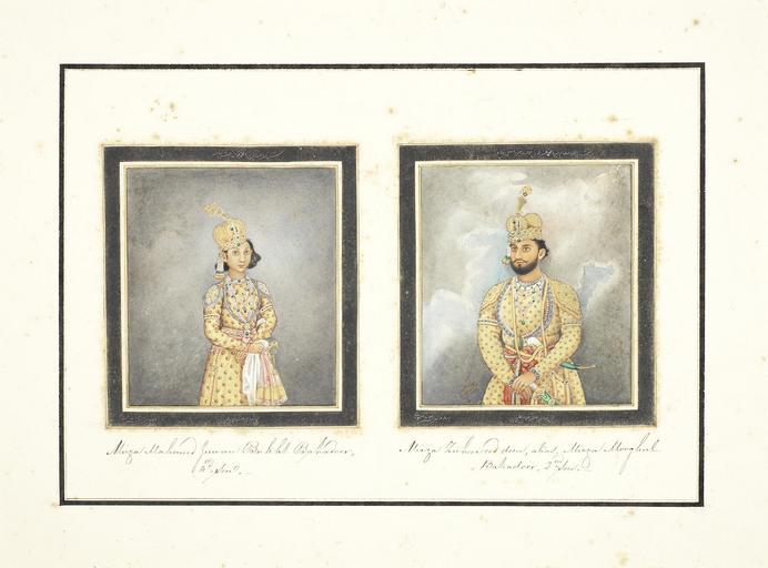 Keywords: Ghulam Ali Khan 016.jpg Two portraits Mirza Mahomed Juwan Bakht Bahadoor 3d son; Mirza Zuheer ood deen alias Mirza Mooghul Bahadur 2nd Son Mirza Muhammad Zahir al-Islam known as Mirza Mughul Bahador on the right and Mirza Muhammad Javan Bakht Bahadur on the left both signed by Ghulam 'Ali Khan A series of 31 paintings by Ghulam Ali Khan fl 1817-55 consisting of views of monuments in and around Delhi and including four portraits of the last Mughal Emperor Bahadur Shah II reg 1837-58 and his sons Watercolour and gold on paper black margin rules three title pages three sheets of portraits all with identifying inscriptions in English and in Persian in nasta'liq script in black ink the portraits with further inscriptions in nasta'liq script with the date November 1852 Christian date written in Arabic in later mounts loose in contemporary green leather-covered despatch box the lid embossed in gold DELHEE 1854 Size paintings 290 x 215 mm and slightly smaller; mounts 318 x 394 mm ; box 435 x 365 x 110 mm http //www bonhams com/auctions/20833/lot/352/ 1852-11 Ghulam Ali Khan 100px 100px PD-Art-100 Sketches of The Delhee Palace Delhee 1854 |