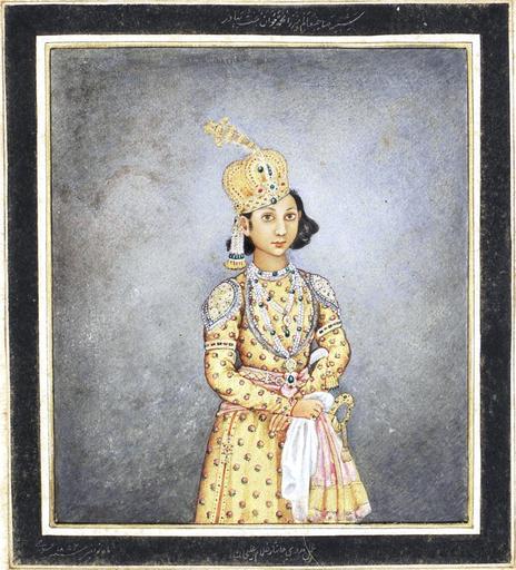 Keywords: Ghulam Ali Khan 016b.jpg Mirza Mahomed Juwan Bakht Bahadoor 3d son Signed by Ghulam 'Ali Khan A series of 31 paintings by Ghulam Ali Khan fl 1817-55 consisting of views of monuments in and around Delhi and including four portraits of the last Mughal Emperor Bahadur Shah II reg 1837-58 and his sons Watercolour and gold on paper black margin rules three title pages three sheets of portraits all with identifying inscriptions in English and in Persian in nasta'liq script in black ink the portraits with further inscriptions in nasta'liq script with the date November 1852 Christian date written in Arabic in later mounts loose in contemporary green leather-covered despatch box the lid embossed in gold DELHEE 1854 Size paintings 290 x 215 mm and slightly smaller; mounts 318 x 394 mm ; box 435 x 365 x 110 mm File Ghulam Ali Khan 016 jpg 1852-11 Ghulam Ali Khan PD-Art-100 People of the Mughal dynasty |