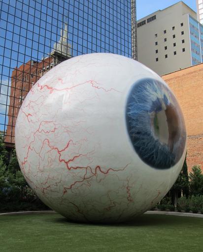 Keywords: giant eyeball enormous orb downtown sculpture eyeball huge staring blood veins iris white urban looking observing watching dallas texas arts