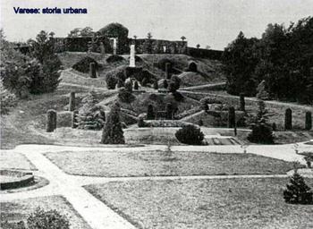 Keywords: Rara immagine che testimonia l'originale assetto del Parco con la parte superiore occupata da un carpineto a berceaux poi sostituito dall'attuale pineta. varese giardinipubblici