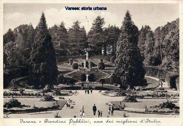 Keywords: Vista del parterre. Dietro la fontana centrale la statua di Umberto I. La fontana superiore, il "grottesco" (1767-69) è sormontata dalla statua dell'Italia liberata. varese giardinipubblici