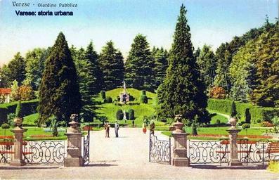 | Keywords: Versione colorata. Vista del parterre. Dietro la fontana centrale la statua di Umberto I. La fontana superiore, il "grottesco" (1767-69) è sormontata dalla statua dell'Italia liberata. All'estrema sinistra è visibile un angolo della costruzione che ospitava il deposito delle carrozze ducali (non più esistente). varese giardinipubblici |