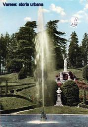 Keywords: Versione colorata. La fontana centrale. Dietro il getto d'acqua il busto di Umberto I. Più in alto la fontana superiore, il "grottesco" (1767-69), è sormontata dalla statua dell'Italia liberata. varese giardinipubblici
