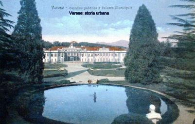 Keywords: Versione colorata. Vista della fontana centrale, del parterre e di Palazzo Estense ripresi da dietro il busto di Umberto I. varese giardinipubblici palazzoestense