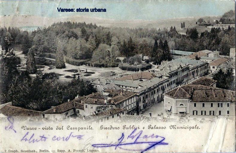 In basso la strettissima via Verbano, subito dopo, affianco a Palazzo Estense (arch. Giuseppe Antonio Bianchi, 1766-73), la casa Sacco/Ghirlanda (arch. Francesco Peverelli, 1808) sostituita nel 1964 dal palazzo della Banca d'Italia (arch. Ignazio Gardella). Di fronte la casa ad angolo che ospita l'albergo Europa (1855). In fondo a Palazzo Estense la filanda costruita nel 1837 e abbattuta nel 1932. Non appare ancora l'edificio multipiano della scuola media che venne costruito nel 1903 e abbattuto negli anni '70. Si sorge all'angolo di via Verdi la portineria di villa Baroggi (ing. Giacomo Cova, 1890) ora scomparsa. In alto a destra una rarissima immagine del parco di villa Quiete dei Sanvito (ex convento dei cappuccini ed ora sede del liceo classico). varese giardinipubblici palazzoestense |