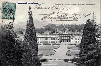 Keywords: Vista dalla pineta del parterre con la grande fontana e Palazzo Estense (1766-73). varese giardinipubblici palazzoestense
