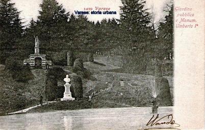 Keywords: Vista sulla fontana centrale e sul busto di Umberto I. Sopra la fontana a grottesco (1767-69) si innalza l'alta statua dell'Italia liberata. varese giardinipubblici