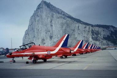 Keywords: GIB 6.jpg en RAF Gibraltar Battle of Britain day Red arrows formed up under the 'Rock' own Petebutt ~ 1988 Aircraft at Gibraltar Airport BAE Hawk Red Arrows